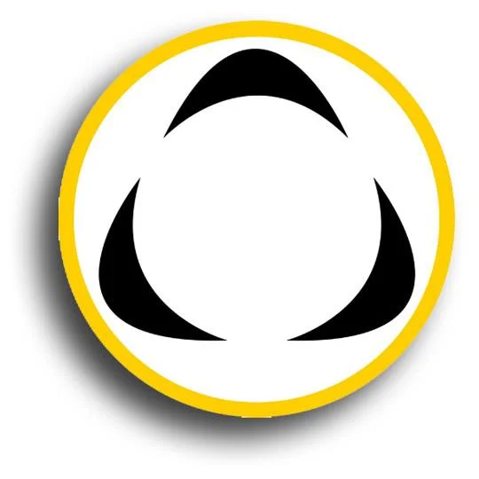 The image consists of three black crescent shapes arranged to form a triangle on a white circle enclosed by a golden ring.